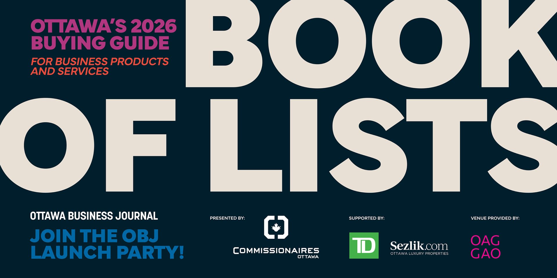 Join us, along with our sponsors Commissionaires Ottawa, TD Canada Trust, Sezlik.com, and the Ottawa Art Gallery, for the official 2026 Book of Lists Launch Party!