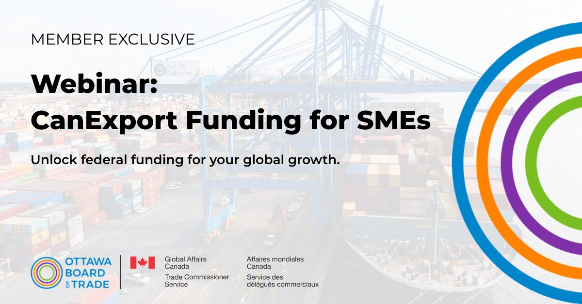 Is your business currently exporting, or thinking about entering global markets? Join the Ottawa Board of Trade for an exclusive members-only webinar about the CanExport SMEs program, which offers competitive funding to eligible Canadian small and medium-sized enterprises with meaningful economic ties to Canada, the capacity to grow internationally, and a clear plan to export Canadian goods and services.
