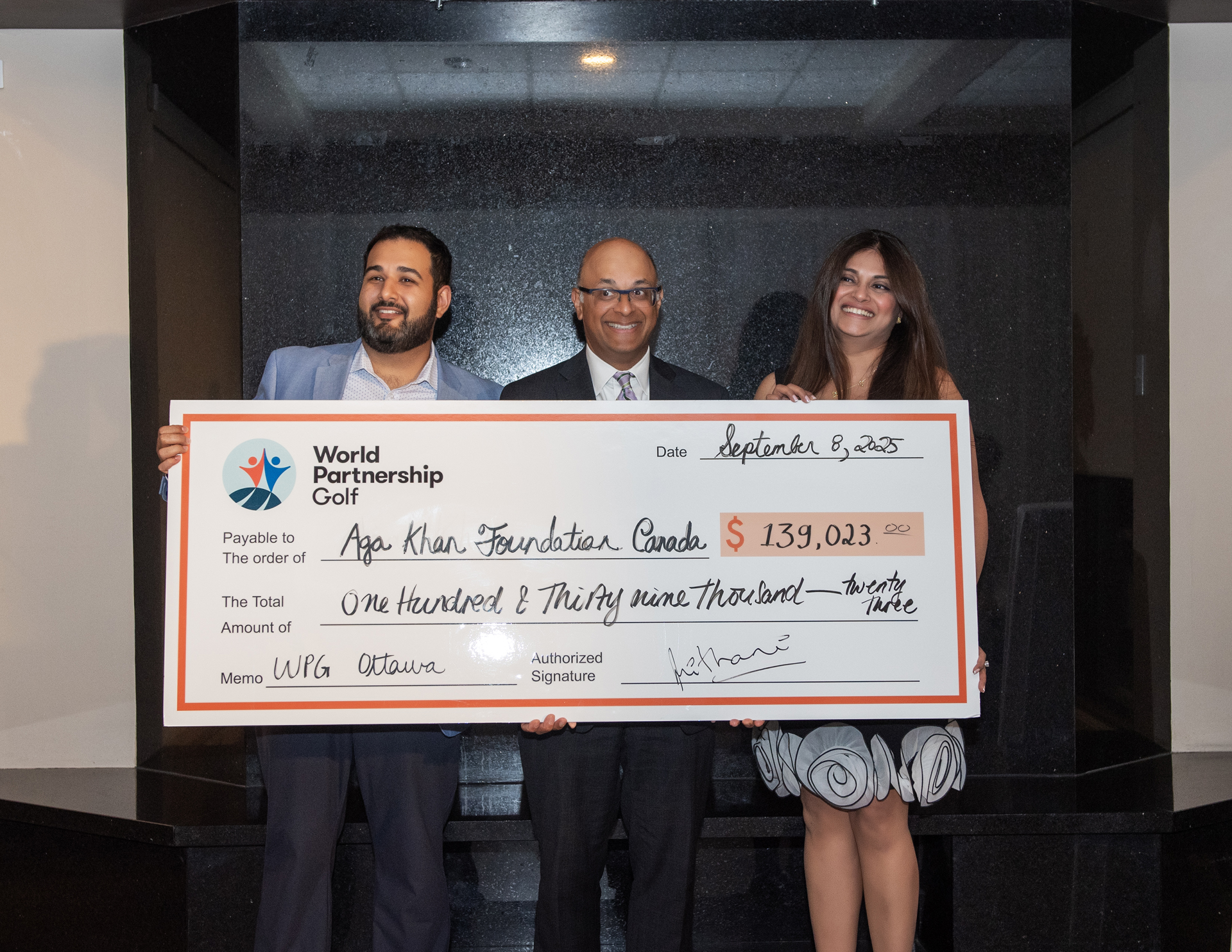 Annual Group Photo right before the shotgun start at The World Partnership Golf, Camelot Golf and Country Club, September 8th, 2025Team Mark Motors Marcus Cuomo and Matt Jones heading off the start the day, at The World Partnership Golf, Camelot Golf and Country Club, September 8th, 2025Yasser Ghazi (Team RBC) and Alex Belisle (Team RBC) out on the green at The World Partnership Golf, Camelot Golf and Country Club, September 8th, 2025.Having some fun on the course Dr. Altaf Sovani (Founder & CEO, ALZEN Inc) laying down while Sean McGrath gets ready to swing while Cindy Gascon, Ryan E. Watson, WPG Chair Shella Mithani look on, at The World Partnership Golf, Camelot Golf and Country Club, September 8th, 2025.Speed hole on a spectacular day at The World Partnership Golf, Camelot Golf and Country Club, September 8th, 2025.Team BMO Layla Darwish, Lee Warrysh, Charlene Morris, Johnny Karmaker posing for a photo with WPG Chair Shella Mithani at The World Partnership Golf, Camelot Golf and Country Club, September 8th, 2025.Team Scanbo Technologies; Fayez Thawer (Azana Investments & Advisory), Merv Clost (Palladium Insurance), Jim Orban (Former Publisher Ottawa Citizen, Ottawa business advisor KTS Properties) and Sebastien Cote (Marc Sports, La Source du Sport, Director of Golf & Master Fitter) taking a swing at The World Partnership Golf, Camelot Golf and Country Club, September 8th, 2025.Chipping contest participant Jason Okpik-Cutten of Cutten Kipnik Nunavik taking one of 3 shots at The World Partnership Golf, Camelot Golf and Country Club, September 8th, 2025.The one and only Ryan E. Watson (Raising the Bid) leading the live auction at The World Partnership Golf, Camelot Golf and Country Club, September 8th, 2025.WPG 2025 bringing in a total of $139,023.00, cheque reveal with Hakim Fakirani (WPG Volunteer), Aga Khan Foundation Canada, Chief Executive Officer Khalil Shariff and Shella Mithani (Chair, World Partnership Golf Ottawa) at The World Partnership Golf, Camelot Golf and Country Club, September 8th, 2025.Platinum Sponsor Oxford Learning Center Rahim Pirani and Shella Mithani with Khalil Shariff (Aga Khan Foundation Canada, Chief Executive Officer) at The World Partnership Golf, Camelot Golf and Country Club, September 8th, 2025.Congratulatory hugs after revealing the amount raised from Nadia Valji (Technology Sales Leader, IBM Canada) to Hakim Fakirani (WPG Volunteer) and Shella Mithani (Chair, World Partnership Golf Ottawa) at The World Partnership Golf, Camelot Golf and Country Club, September 8th, 2025.